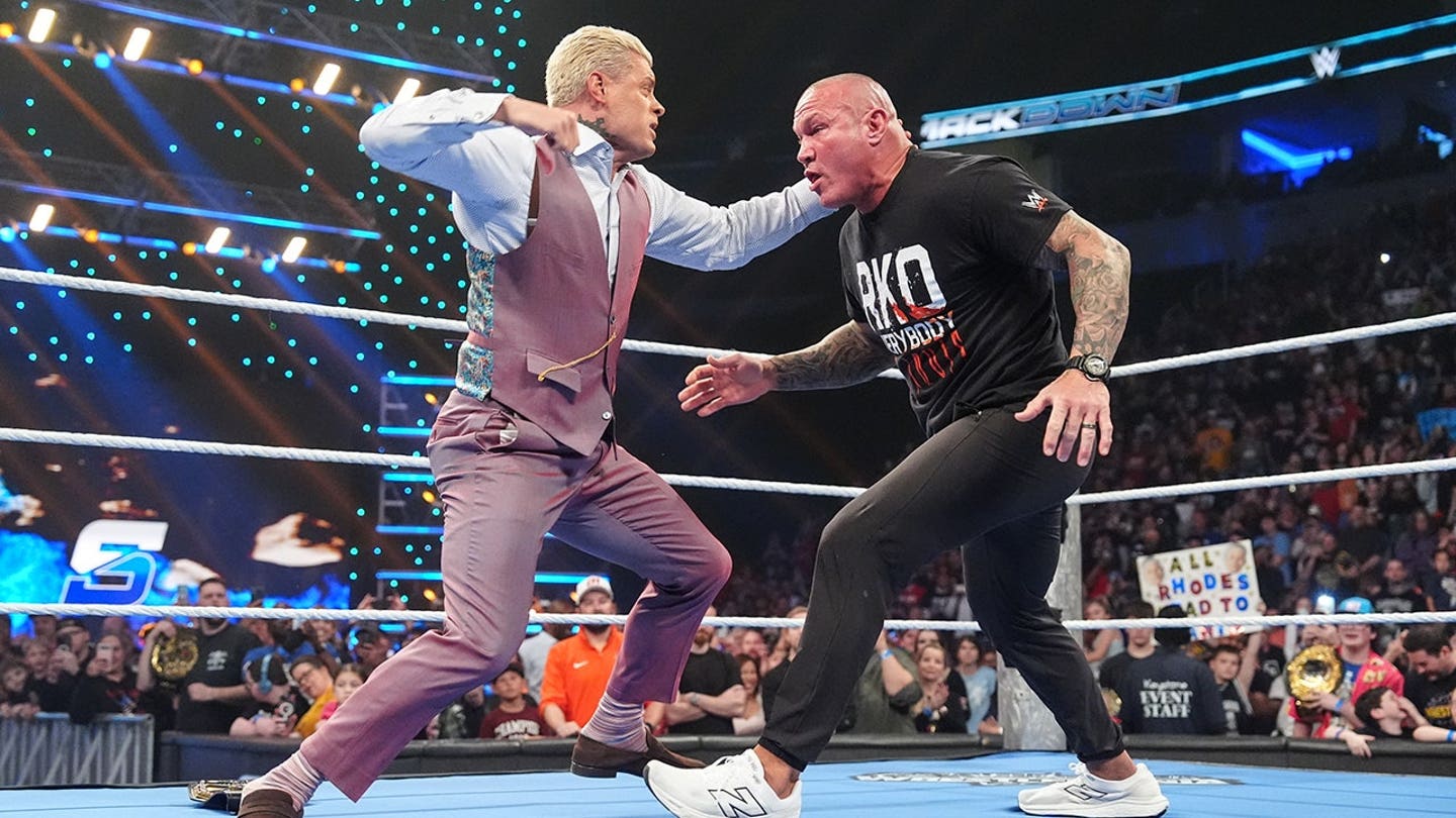 Cody Rhodes and Randy Orton wrestle on SmackDown at the Enterprise Center in St. Louis, Missouri on April 3, 2026. (Georgiana Dallas/WWE)