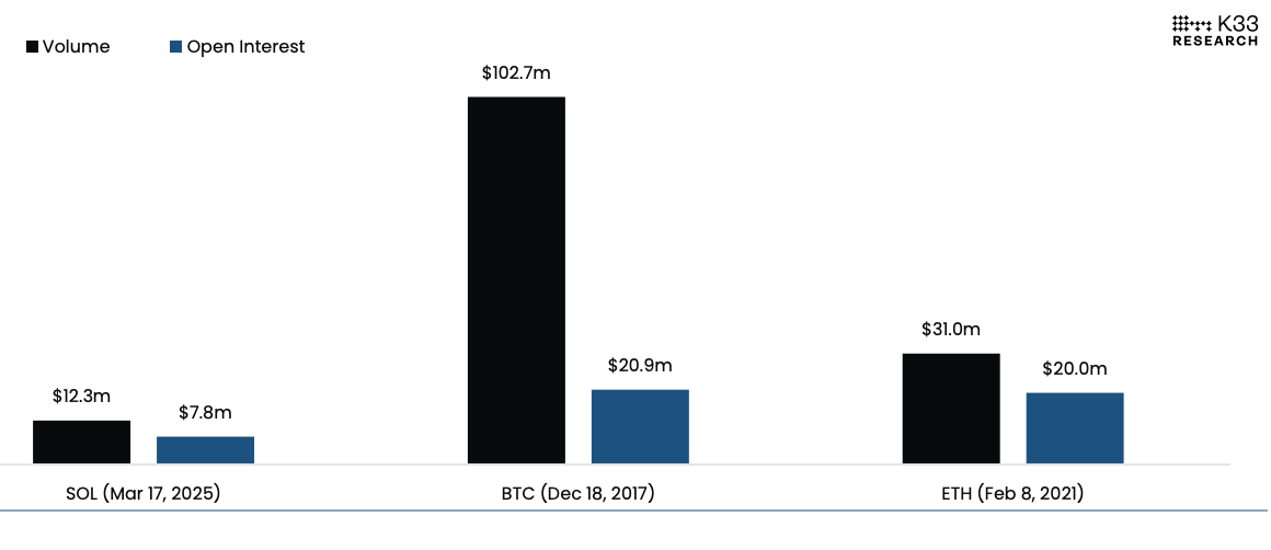 The volume of the first day and the open interest in Sol, BTC and ETH, adjusted to market capitalization. (Research K33)