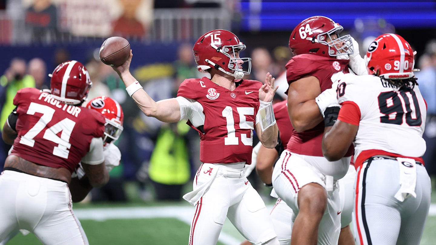 Alabama Crimson Tide quarterback Ty Simpson throws against the Georgia Bulldogs on Saturday in Atlanta. (Kevin C. Cox/Getty Images)