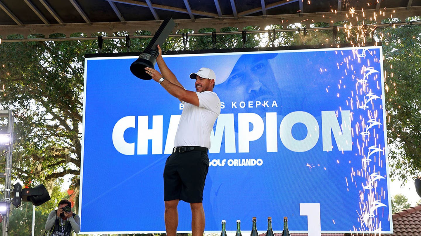Captain Brooks Koepka of Smash GC famous with the trophy after winning the Liv Golf Invitational – Orlando at the Orange County National on April 2, 2023, in Florida. (Mike Ehrmann / Getty Images)