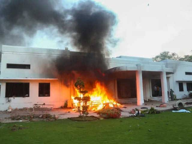 Jinnah House (Lahore Corps Commander’s House), set on fire by supporters of former Prime Minister Imran Khan during a protest against his arrest, in Lahore, May 9, 2023. PHOTO: Reuters/FILE