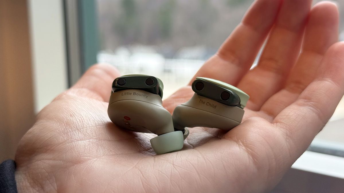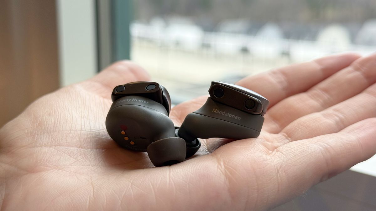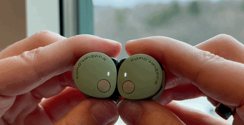 With Grogu, he joins green with a light brown for the main shell – the ear tips are green and several are included in the box, but there is also an Aurébesh writing included outside. Printed on headphones, however – facing the ear – is another emblematic sentence. In the case of growls, it is “The Child” on the left earpiece and “Little Bounty” on the right.