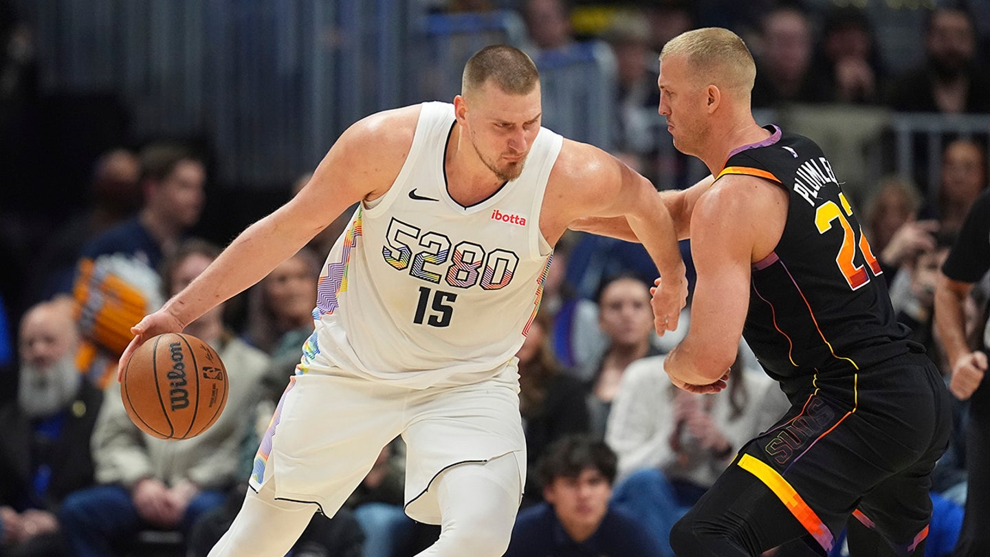The center of Denver Nuggets Nikola Jokic, before, passes in front of the center of Phoenix Suns Mason Plumlee in the first half of a basketball match of the NBA on Friday March 7, 2025 in Denver. (AP photo / David Zalubowski)