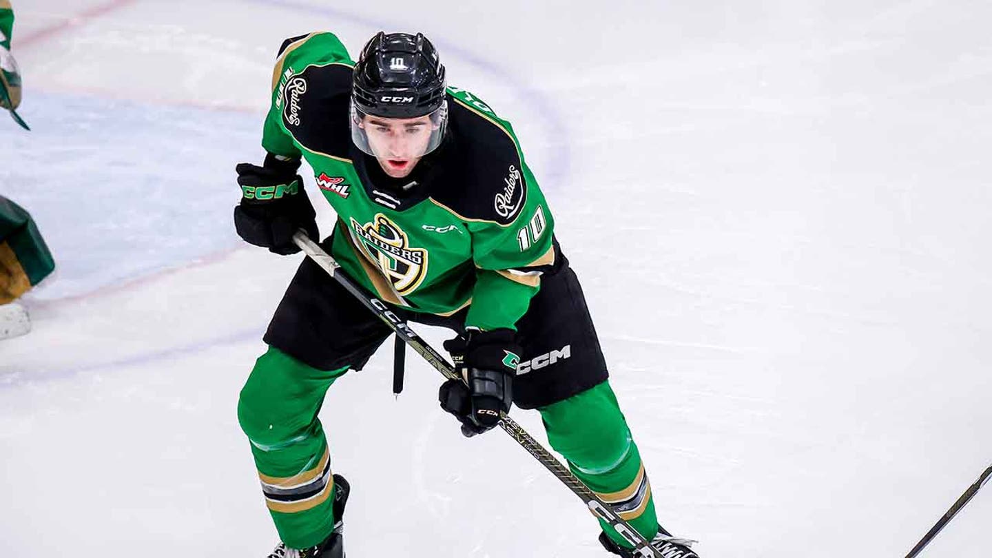 Terrell Goldsmith, n ° 10 of Prince Albert’s raiders, is preparing for a third period faced with Winnipeg ice in Wayne Fleming Arena on March 18, 2023, in Winnipeg, Manitoba, Canada. (Jonathan Kozub / Getty Images)