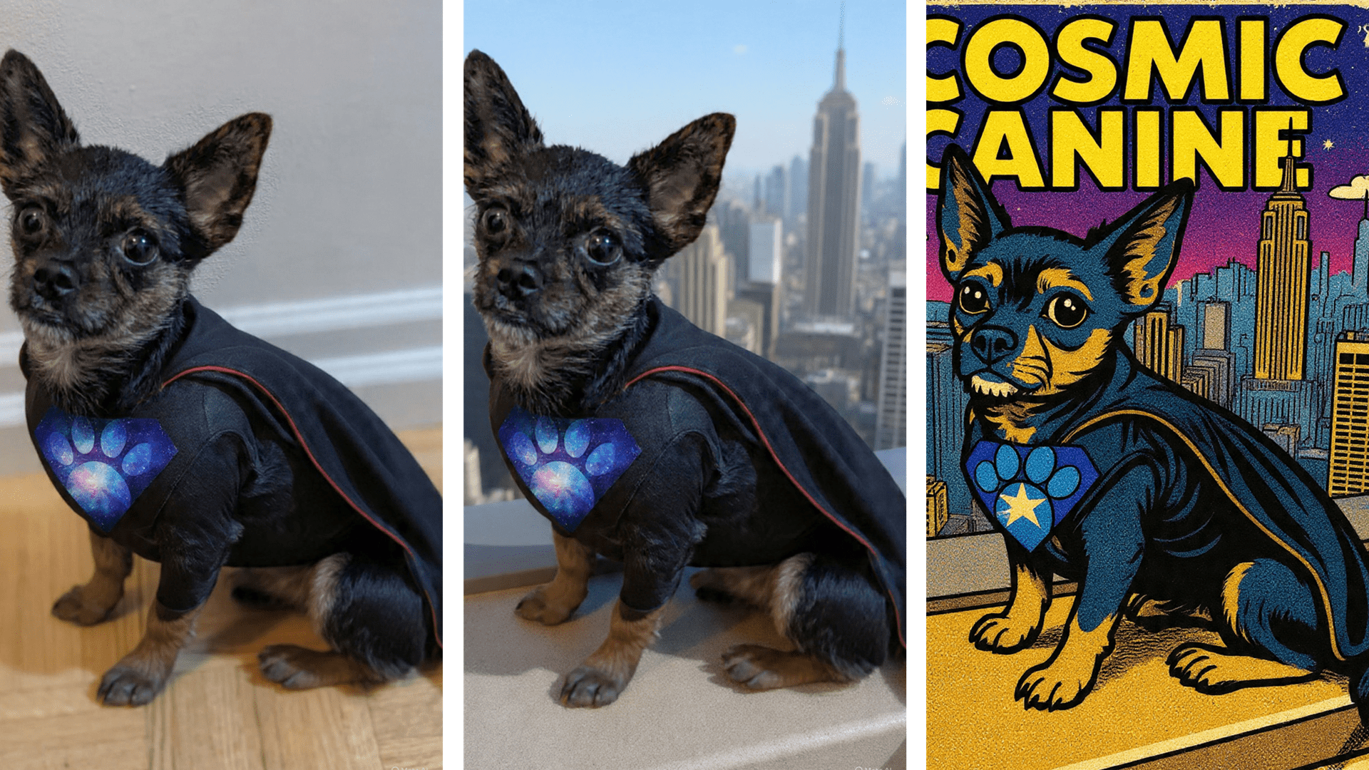 Meta AI decided that I was literally talking about the world’s most famous superhero. Intellectual property rules are clearly not the first priority of AI in its production. Still, as wonderful as she looked, I didn’t want my dog’s other identity to be Captain Copyright Infringement, so I used Restyle to “Change the superhero emblem to something related to space and dogs.”
