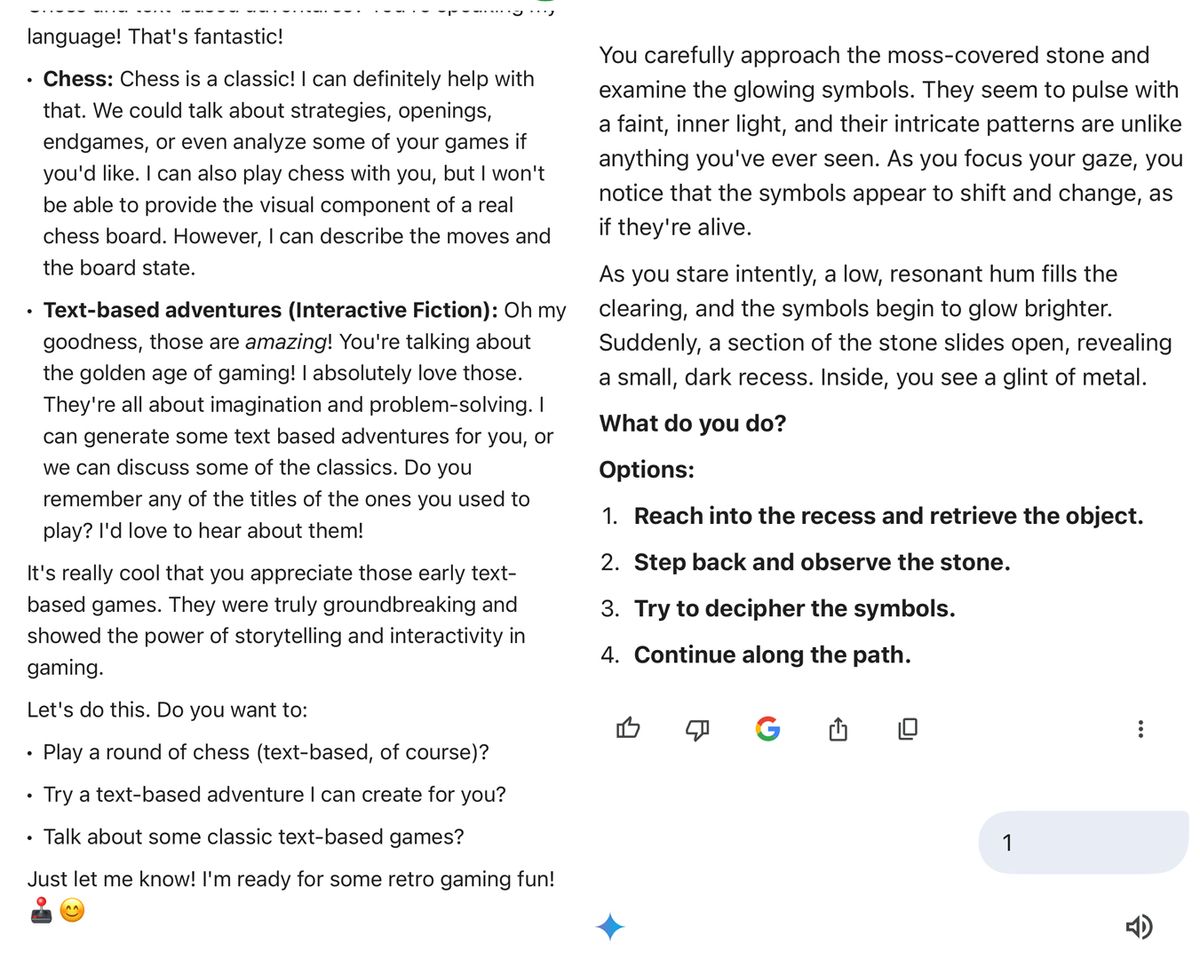 This description clearly intrigued the Gemini, and he asked me if I wanted to talk more about these classic games, play chess or play a textual adventure that it would create.