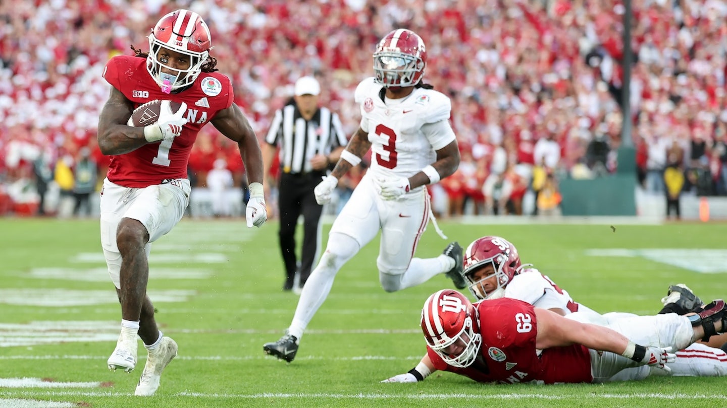 Roman Hemby (1) of the Indiana Hoosiers runs with the ball in the fourth quarter against the Alabama Crimson Tide in a College Football Playoff quarterfinal at Rose Bowl Stadium on January 1, 2026, in Pasadena, California. (Sean M. Haffey/Getty Images)