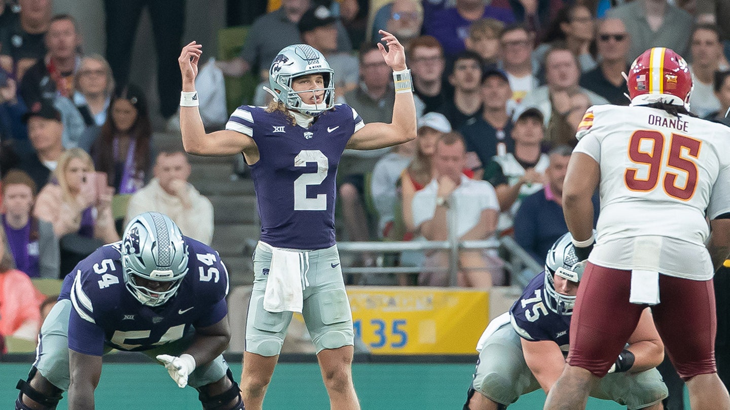 Avery Johnson of the Kansas State Wildcats gestures during the 2025 Aer Lingus Classic game between Kansas State and Iowa State at Aviva Stadium on August 23, 2025 in Dublin, Ireland. (Mario Hommes/DeFodi Images/DeFodi via Getty Images)