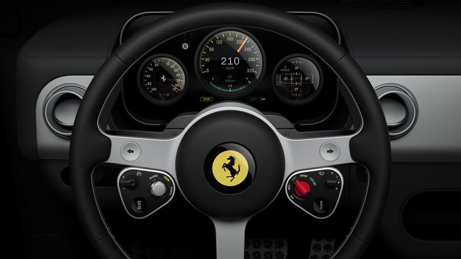 So let’s move on to the Ferrari Luce, and for now we only have a teaser of the electric vehicle’s cabin. A full reveal is expected in May, but now we have an official look at the steering wheel, gauge cluster, dashboard and center console.