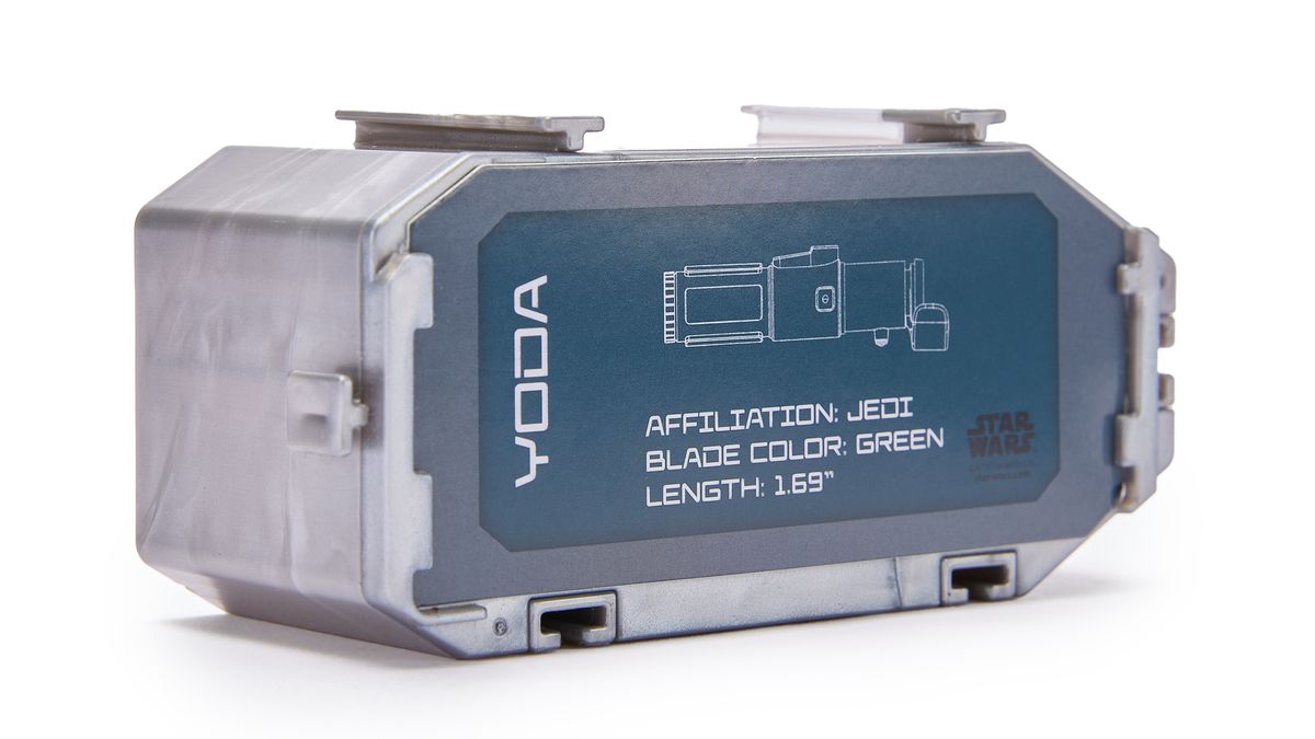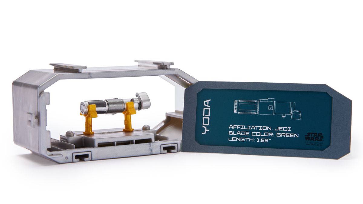 Once unboxed, you’ll find each of the lightsabers in a Star Wars-style crate, complete with a card showing who used the lightsaber and other key details. Maybe they were transported on the Millennium Falcon or kept in a storage bay on the Death Star! The display case is clear and each display case connects to the others that you unbox for easy display.