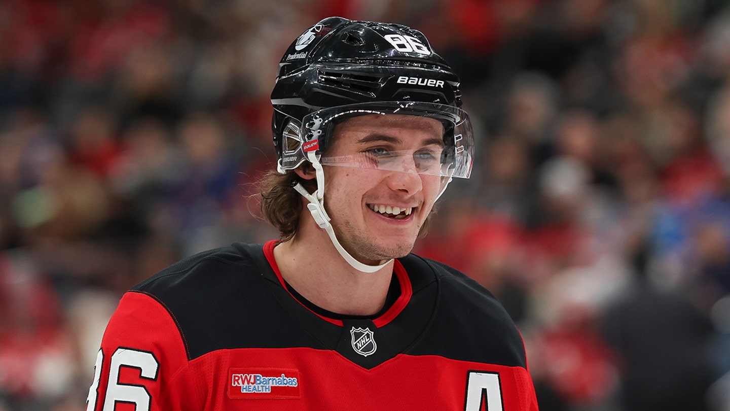 Jack Hughes of the New Jersey Devils attends a game between the New York Rangers and the New Jersey Devils at the Prudential Center on March 7, 2026 in Newark, New Jersey. (Andrew Mordzynski/Icon Sportswire via Getty Images)