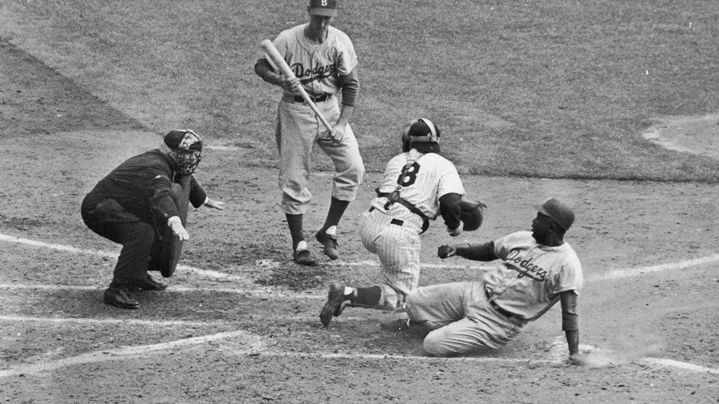 Jackie Robinson, Brooklyn Dodgers, steals the marble during the World Series match against New York Yankees in New York. (Hulton Archive / Getty Images)