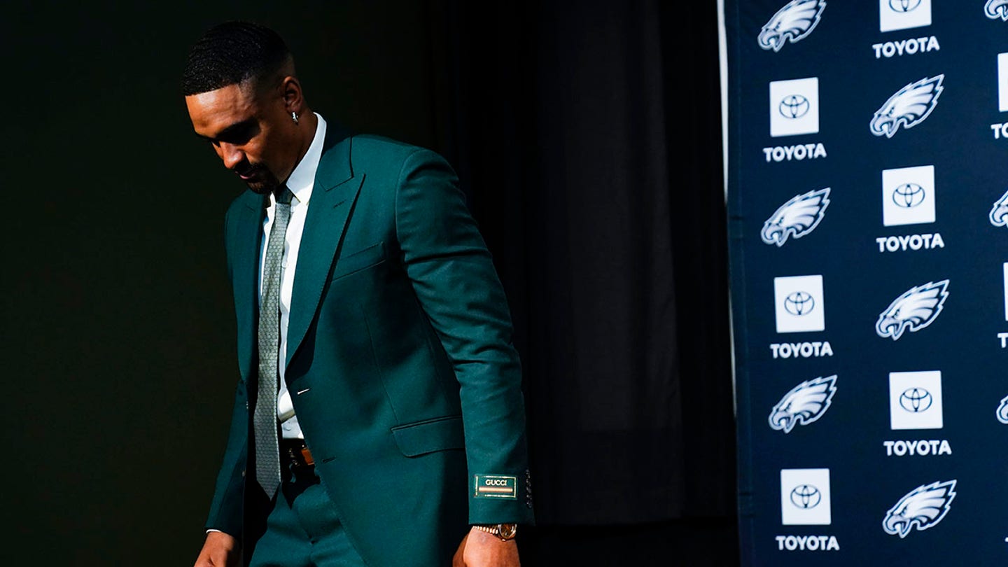 The quarter of the Eagles of Philadelphia, Jalen, Hurts Hurts out of the scene after a press conference in Philadelphia on April 24, 2023. (AP photo / Matt Rourke)