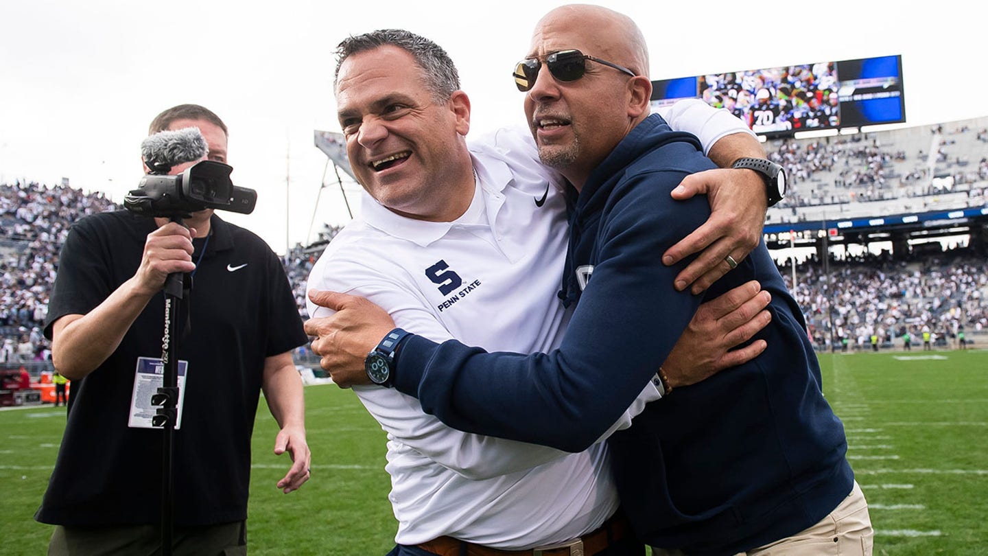 Penn State athletic director Pat Kraft gives a big hug to head football coach James Franklin after a 33-24 victory against Indiana at Beaver Stadium Saturday, Oct. 28, 2023, in State College, Penn. (IMAGINE)