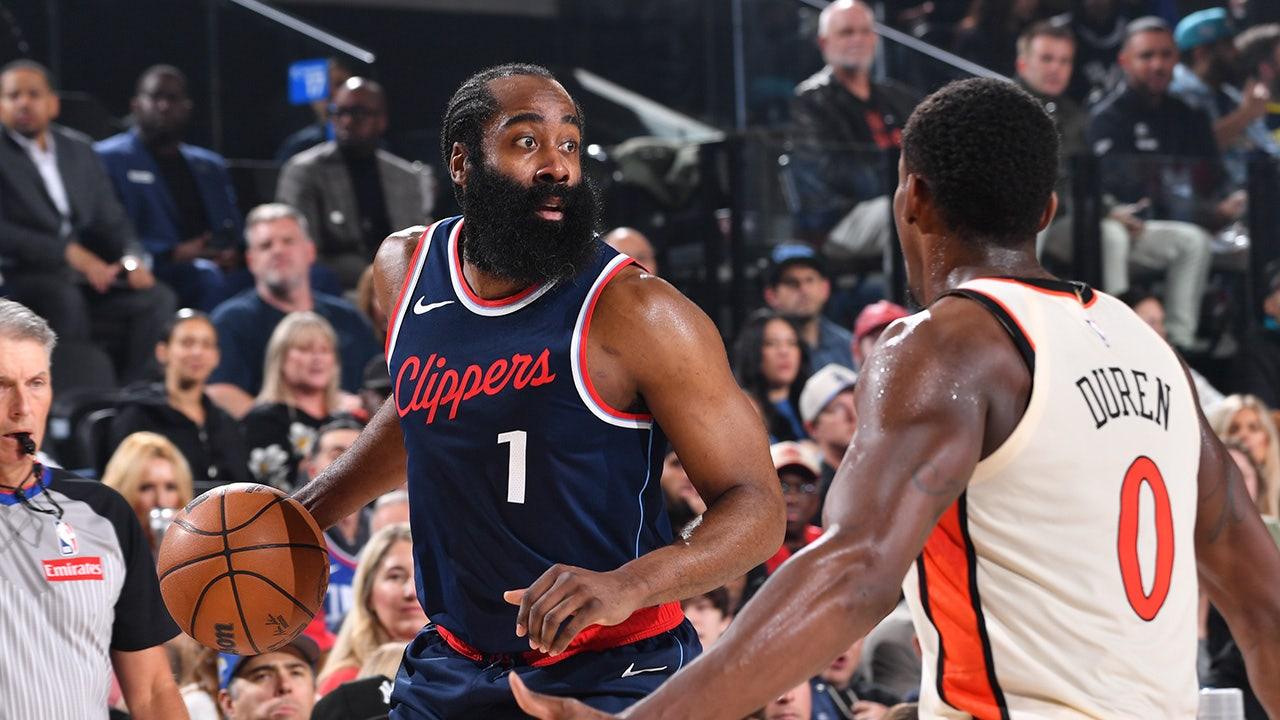 James Harden N ° 1 of the Clippers manages the ball during the match against the Pistons de Detroit on March 5, 2025 in Intuit Dome in Los Angeles, California. (Juan Ocampo / NBAE via Getty Images)