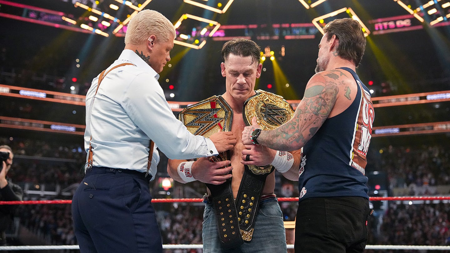 Cody Rhodes and CM Punk give John Cena the undisputed WWE title and the world heavyweight title during Saturday night’s main event at Capital One Arena on December 13, 2025 in Washington DC. (Rich Freeda/WWE via Getty Images)