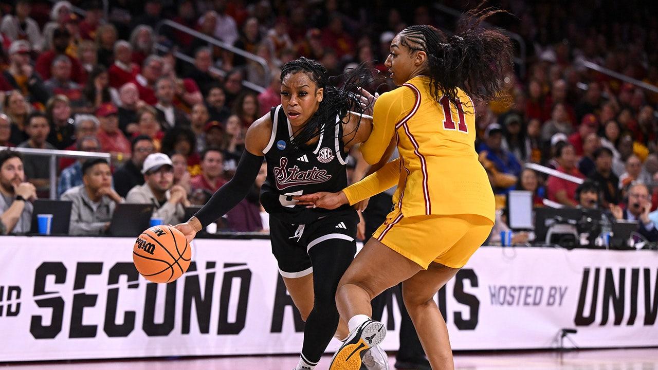 Chandler Prater n ° 5 of the Bulldogs of the state of the Mississippi led against Kennedy Smith # 11 of the Trojan horses of the USC in the second round of the NCAA 2025 women’s basketball tournament which was held at the Galen Center on March 24, 2025 in Los Angeles, California. (Photos John W. McDonough / NCAA via Getty Images)