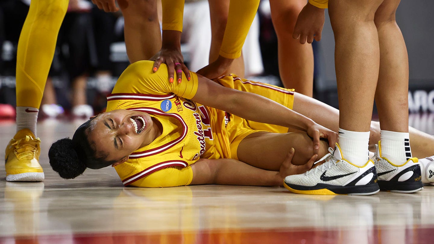 South California goalkeeper Juju Watkins (12) reacts on the ground after an injury during the first half against the state of Mississippi in the second round of the Basketball tournament at the NCAA University on Monday, March 24, 2025, in Los Angeles. (AP photo / Jessie Alcheh)