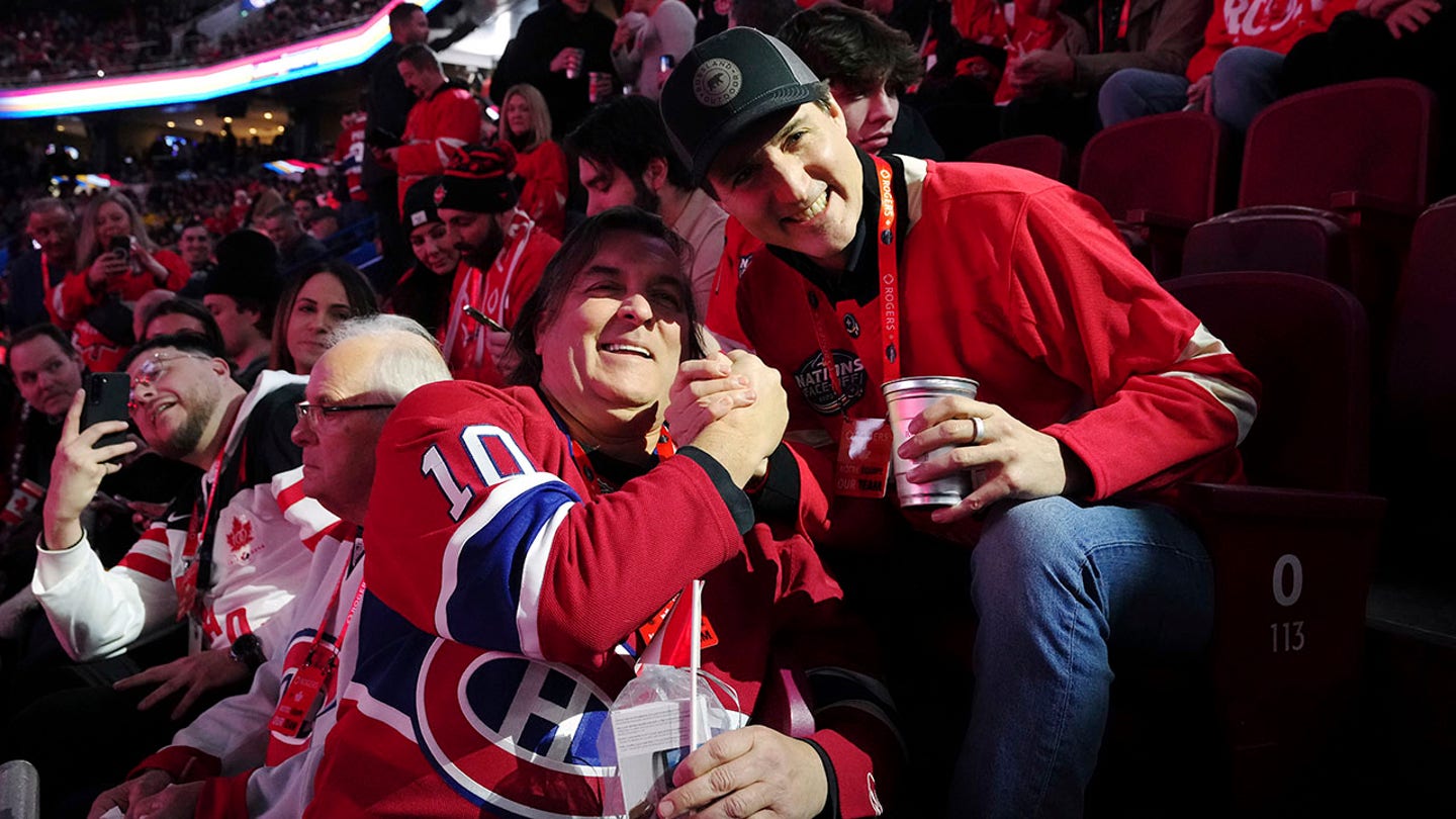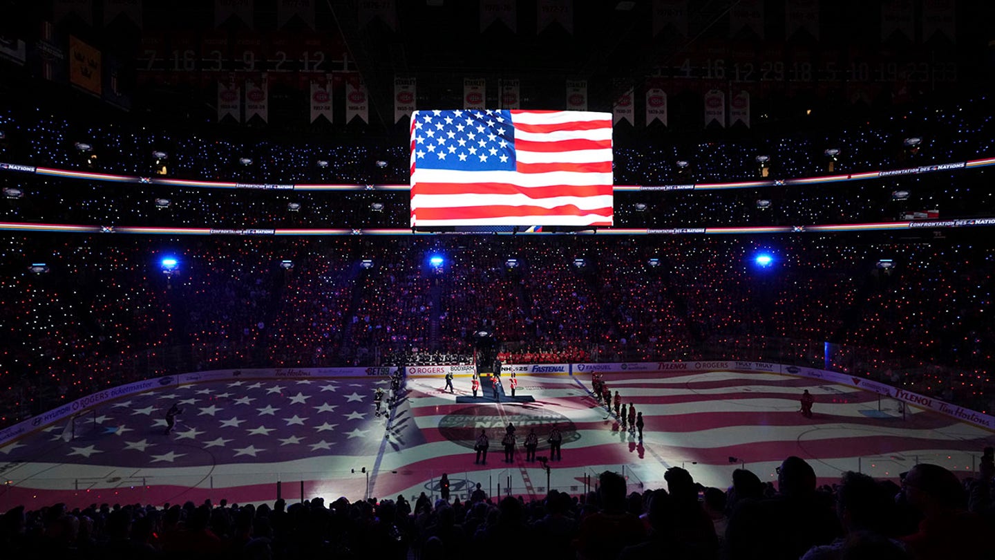 Players and fans represent the US national anthem before the 4 nations hockey match in Montreal on Saturday, February 15, 2025. (Christinne Muschi / The Canadian Press via AP)