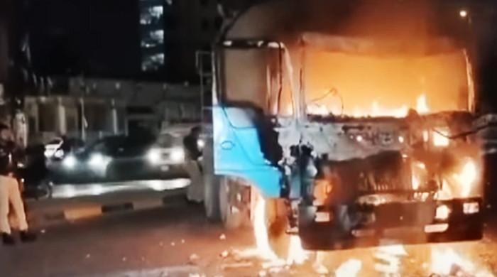 A fiery cement cement mixer after its driver killed a motorcyclist in Karachi, March 21, 2025. – Screengrab / Geonews