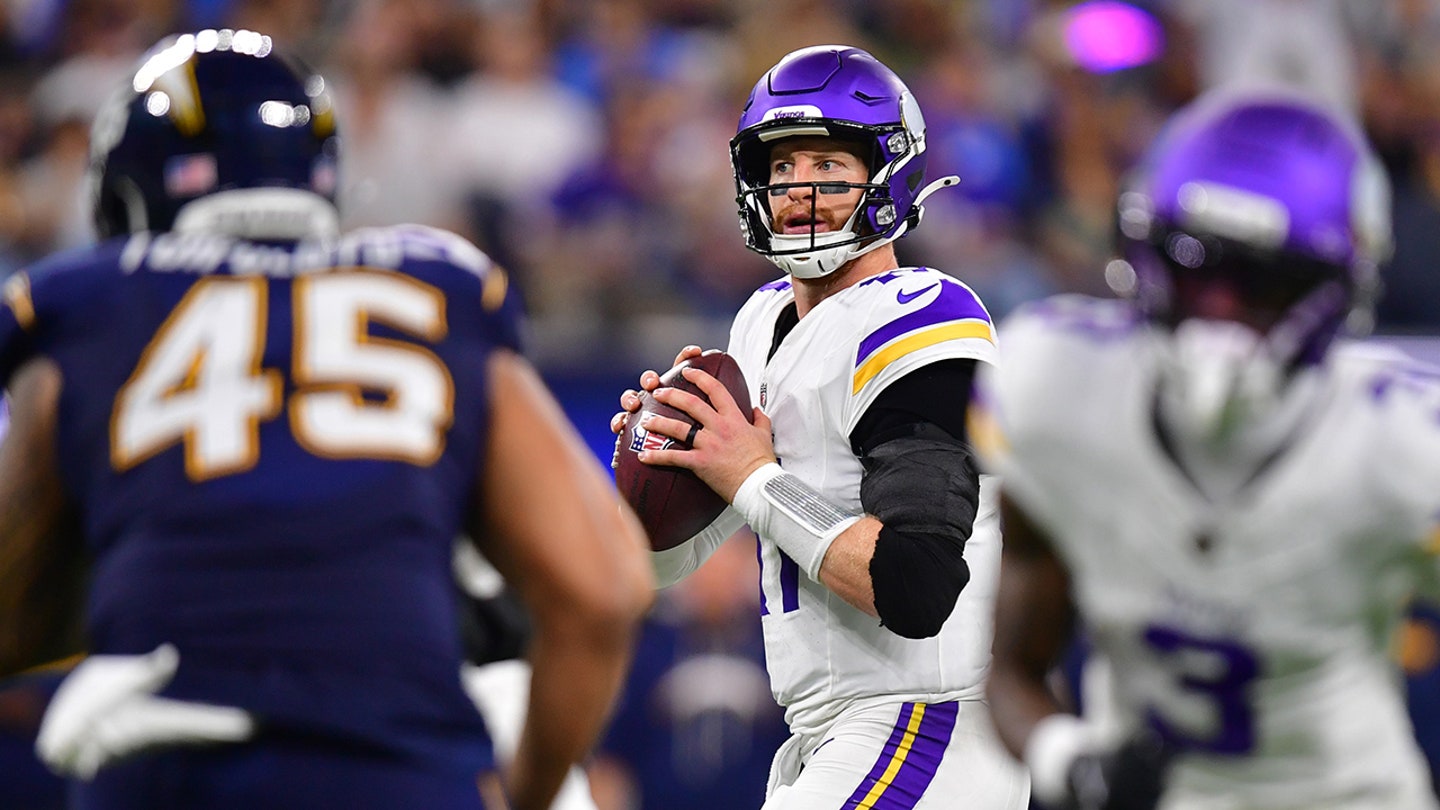 Minnesota Vikings quarterback Carson Wentz (11) returns to pass against the Los Angeles Chargers during the second half at SoFi Stadium on October 23, 2025 in Inglewood, California. (Gary A. Vasquez/Imagn Images)