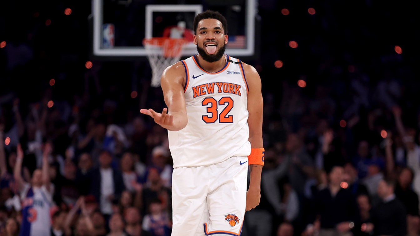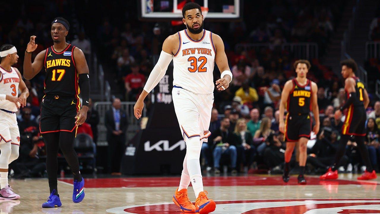 New York Knicks center Karl-Anthony Towns reacts during the first half of an NBA game against the Atlanta Hawks in Atlanta on April 6, 2026. (Colin Hubbard/AP)