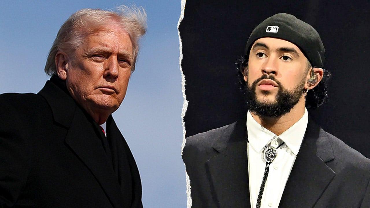 (Left) U.S. President Donald Trump boards Air Force One at Joint Base Andrews in Prince George’s County, Maryland, January 27, 2026. (Right) Bad Bunny performs on his Most Wanted Tour at State Farm Arena in Atlanta, Georgia, May 15, 2024. (Gain McNamee/Getty Images; Getty Images)