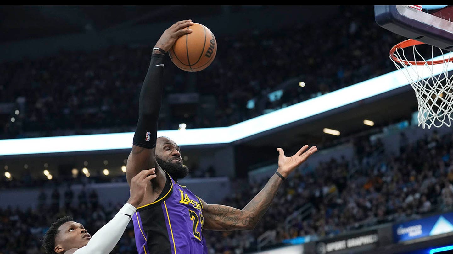 The Los Angeles Lakers striker LeBron James draws a rebound in front of the goalkeeper of the Indiana Pacers Benédict Mathurin in Indianapolis, on Wednesday March 26, 2025. (AP photo / AJ MAST)