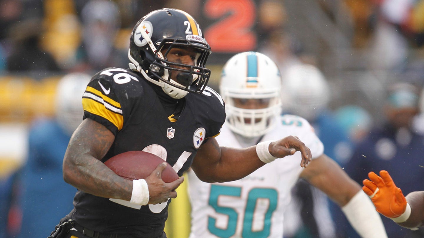 Pittsburgh Steelers Running Back Le’Veon Bell (26) transports the ball while the Olivier Vernon de Miami Dolphins (50) continues in the fourth quarter to Heinz Field in Pittsburgh on December 8, 2013. (Charles Leclaire / USA TODAY SPORTS)