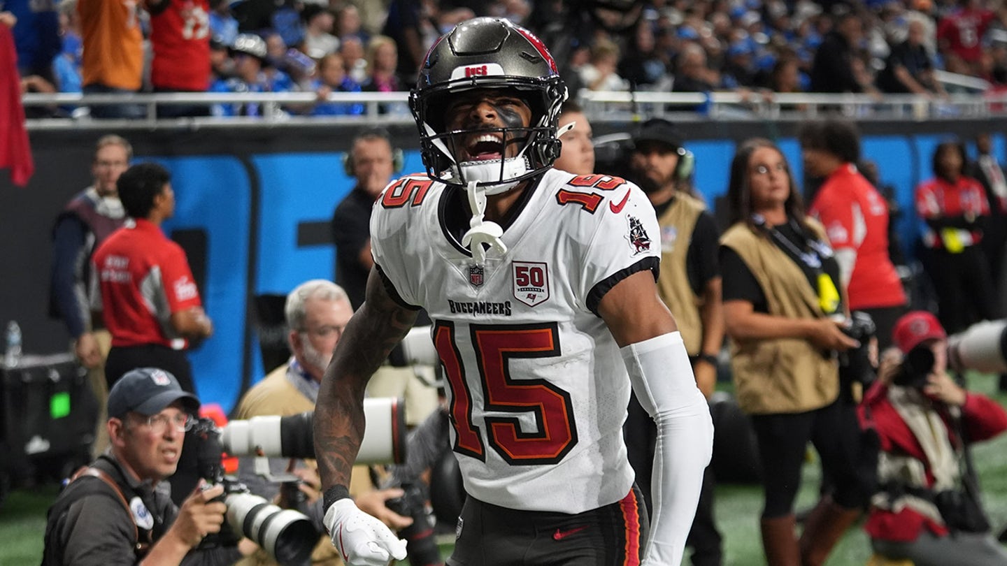 Tampa Bay Buccaneers wide receiver Tez Johnson (15) celebrates a touchdown against the Detroit Lions during the second half of an NFL football game, Monday, Oct. 20, 2025, in Detroit. (AP Photo/Paul Sancya)