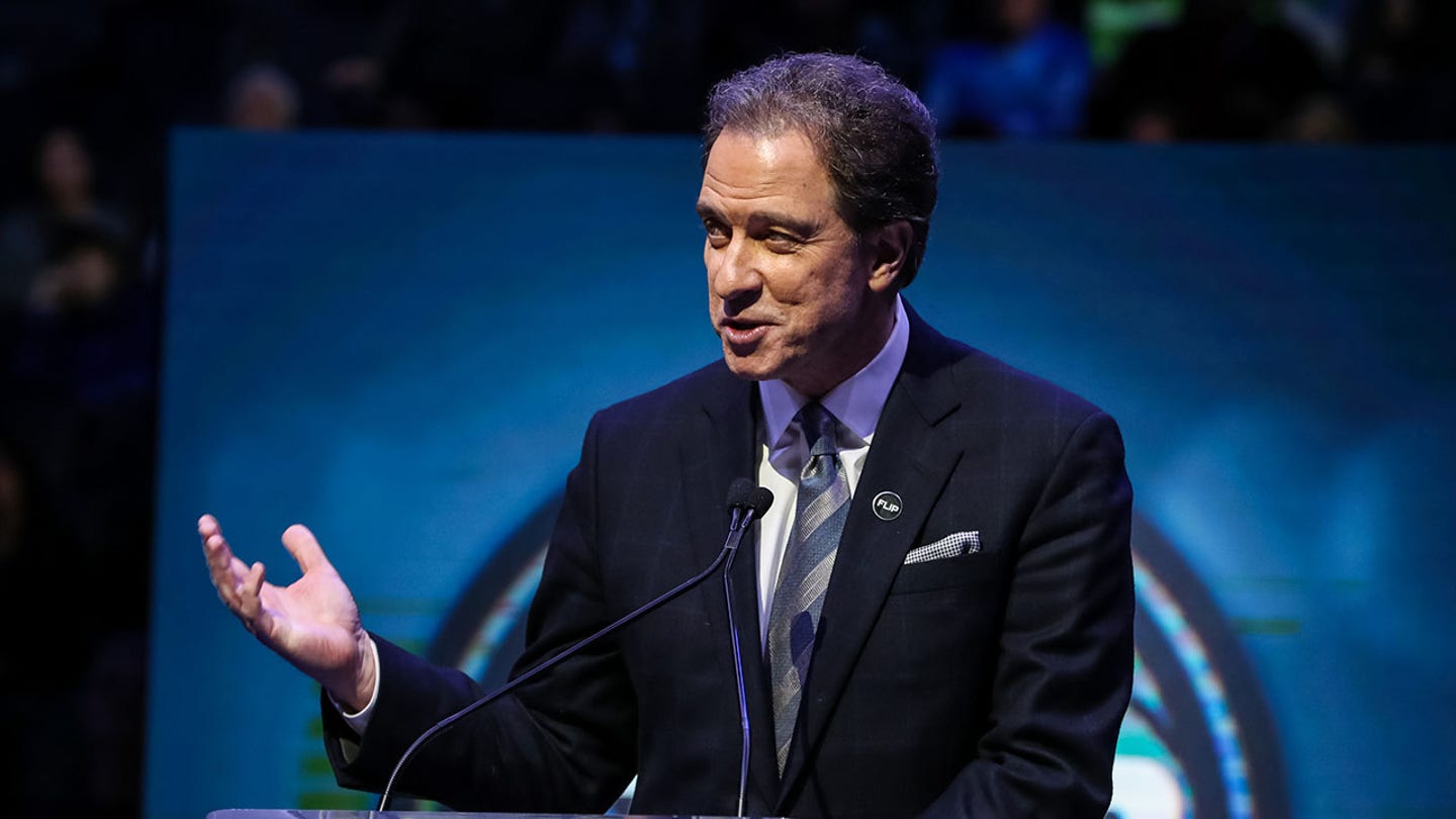 Kevin Harlan speaks during a ceremony in honor of the former chief coach of Minnesota Timberwolves, Flip Saunders, before a match against the Los Angeles Lakers, on February 15, 2018, in Minneapolis. (Hemmelgarn-USA TODAY SPORTS brace)