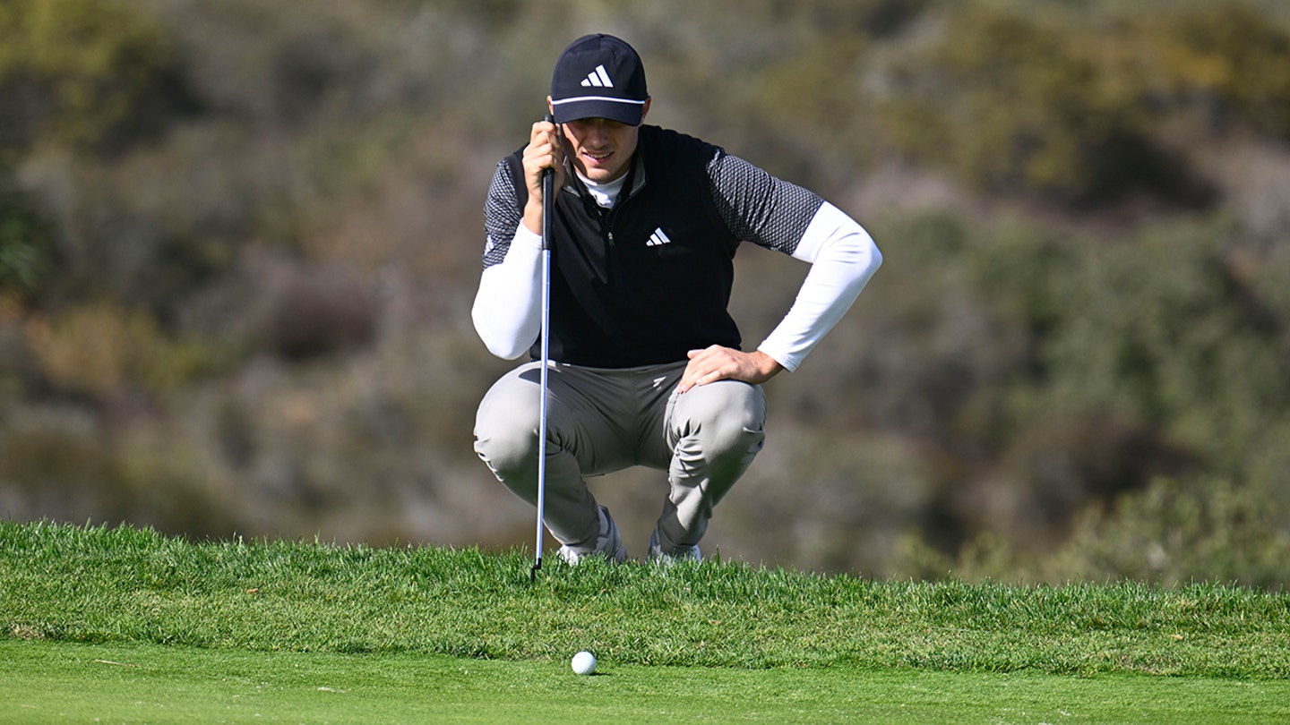 Ludvig Aberg aligns a putt on the seventh hole in the second round of the Genesis Invitational Golf Tournament in Torrey Pines. (Images of Denis Poroy-Imagn)