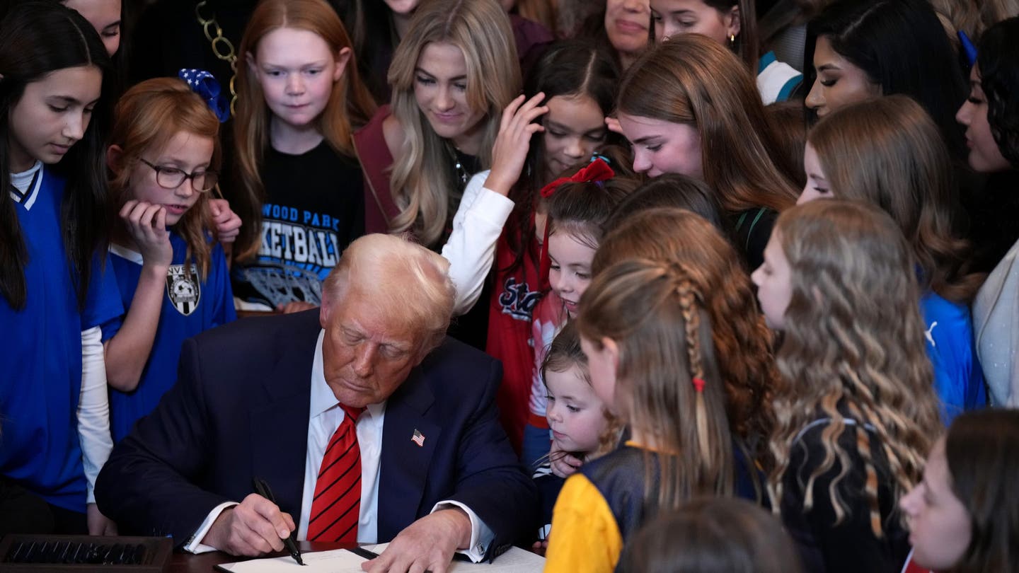 President Donald Trump, joined by female athletes, signs the executive decree “No Men in Women’s Sports” in the East Room of the White House on February 5, 2025, in Washington, DC (Images Andrew Harnik / Getty)