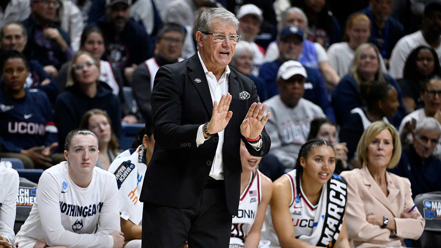 Uconn head coach Geno Auriemma made gestures during the second half against the state of southern Dakota in the second round of the NCAA tournament on Monday, March 24, 2025 in Storrs, Conn. (AP photo / Jessica Hill)