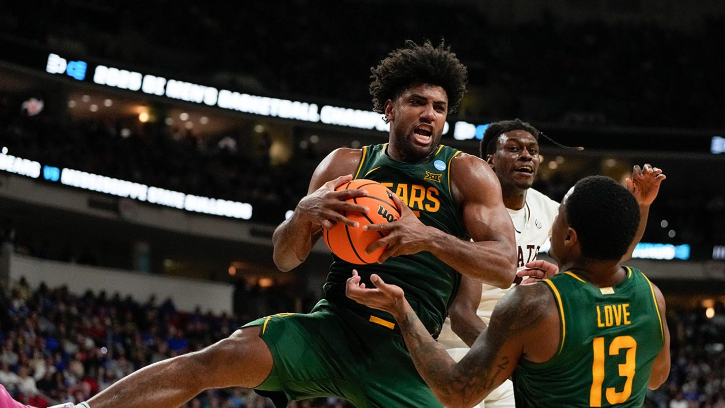 Baylor carries the striker Norchad Omier (15) rebounds the ball against the Bulldogs striker from the state of Mississippi, Keshawn Murphy (3) during the second half in the first round of the NCAA tournament at the Lenovo Center. (Bob Donnan-Imagn images)