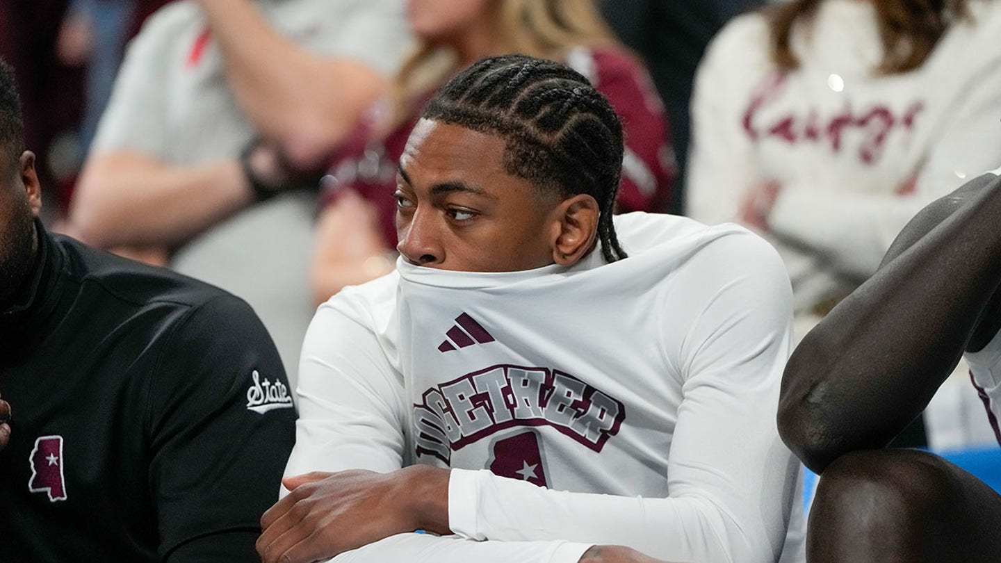 The goalkeeper of the Bulldogs of the State of Mississippi, Dellquan Warren (6), reacts on the bench during the second half against the Baylor Bears in the first round of the NCAA tournament at the Lenovo Center. (Bob Donnan-Imagn images)