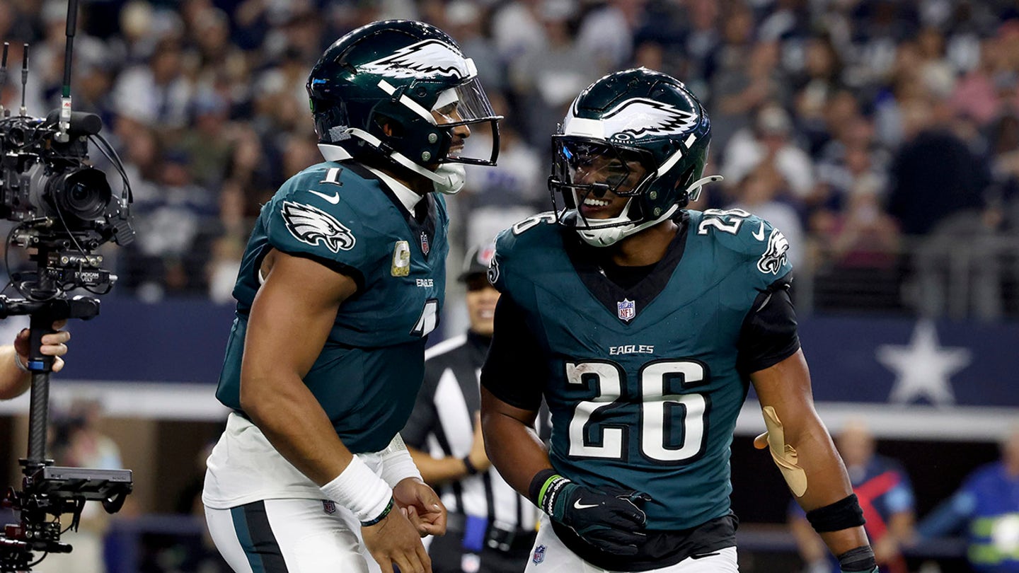 Jalen Hurts, # 1, and Saquon Barkley, # 26, celebrate after Hurts, n ° 1, and Saquon Barkley, # 26, after Hurts, Sunday, November 10, 2024. (AP photo / Gareth Patterson)