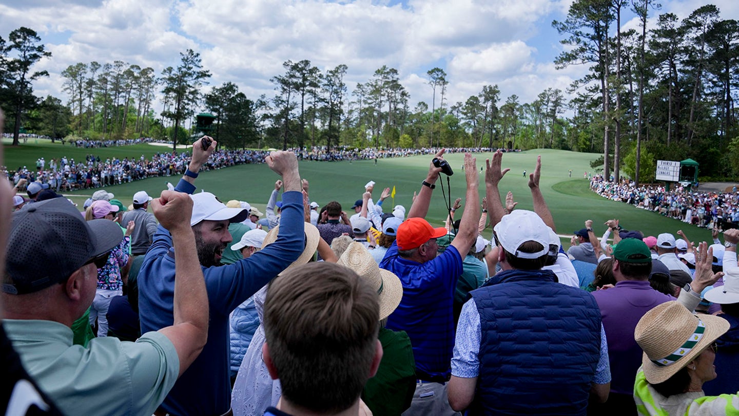 The gallery bursts into applause after Rory McILroy Eagles No. 2 During the third round of the Masters tournament at the Augusta National Golf Club. (Images Grace Smith-Imagn)