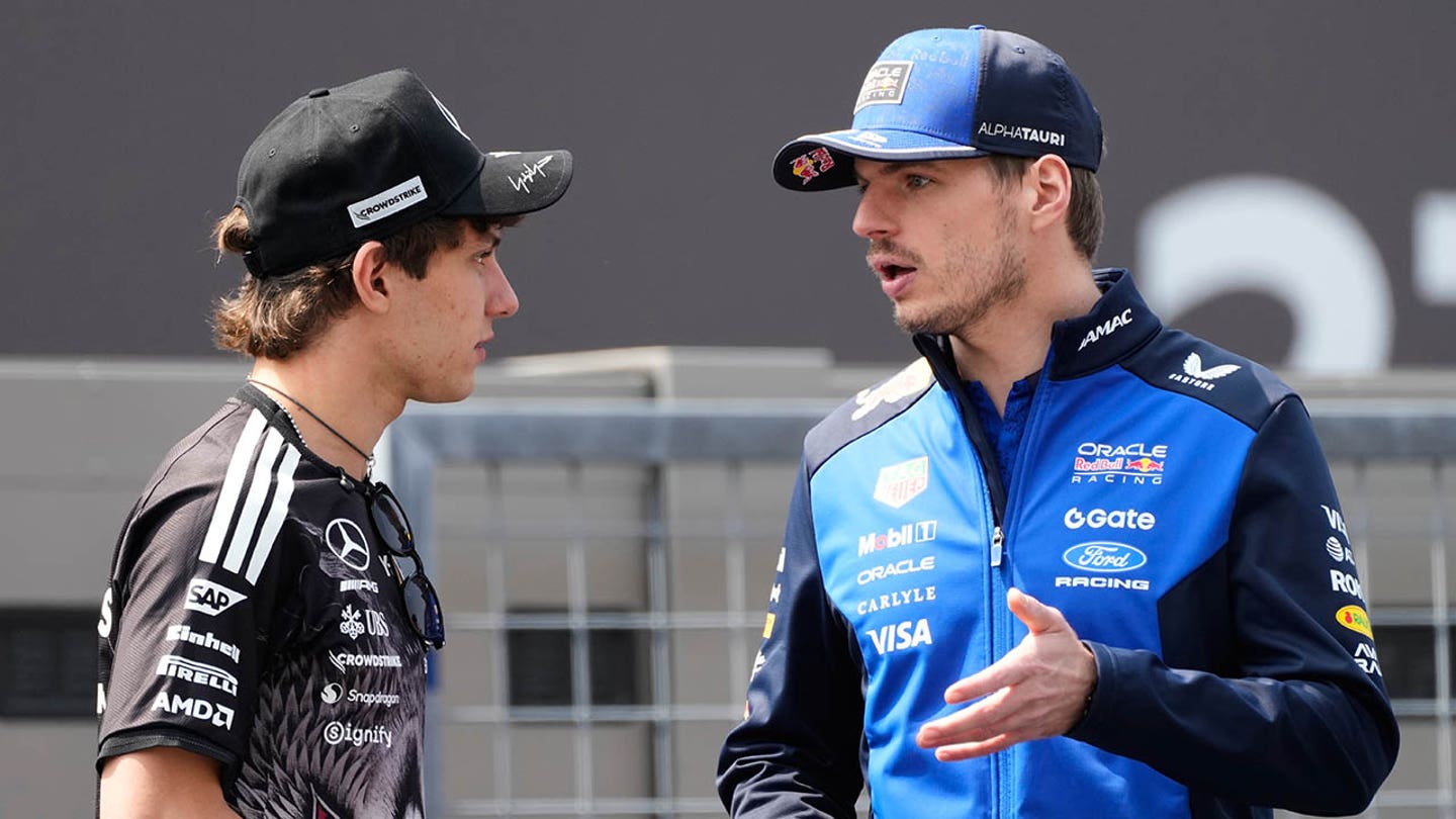 Red Bull driver Max Verstappen, right, of the Netherlands, and Mercedes driver Kimi Antonelli of Italy, speak during the drivers’ parade before the Formula One Japanese Grand Prix in Suzuka, central Japan, Sunday March 29, 2026. (AP Photo/Eugene Hoshiko)