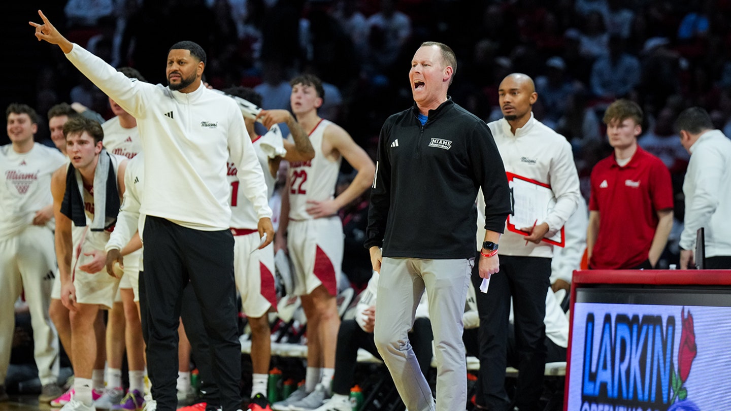Miami (OH) RedHawks head coach Travis Steele works the sideline against the Ohio Bobcats in the second half at Millett Hall on February 13, 2026. (Aaron Doster/Imagn Images)