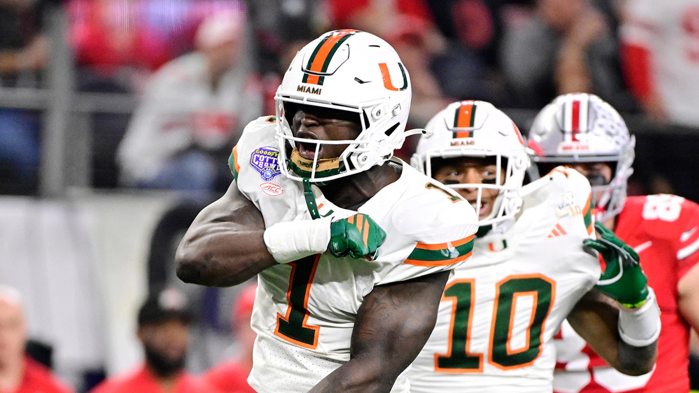 Mohamed Toure of the Miami Hurricanes reacts against the Ohio State Buckeyes during the second half of the College Football Playoff quarterfinal game at AT&T Stadium on December 31, 2025 in Arlington, Texas. (CFP/Getty Images)