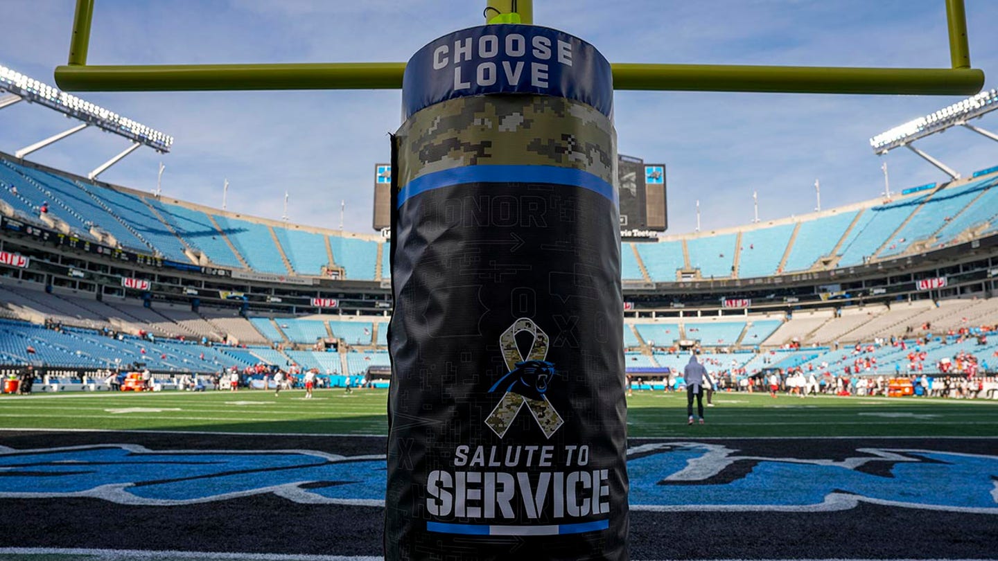 “Salute to Service” signage during pregame warmups between the Carolina Panthers and the Kansas City Chiefs at Bank of America Stadium. (Jim Dedmon/Imagn Images)