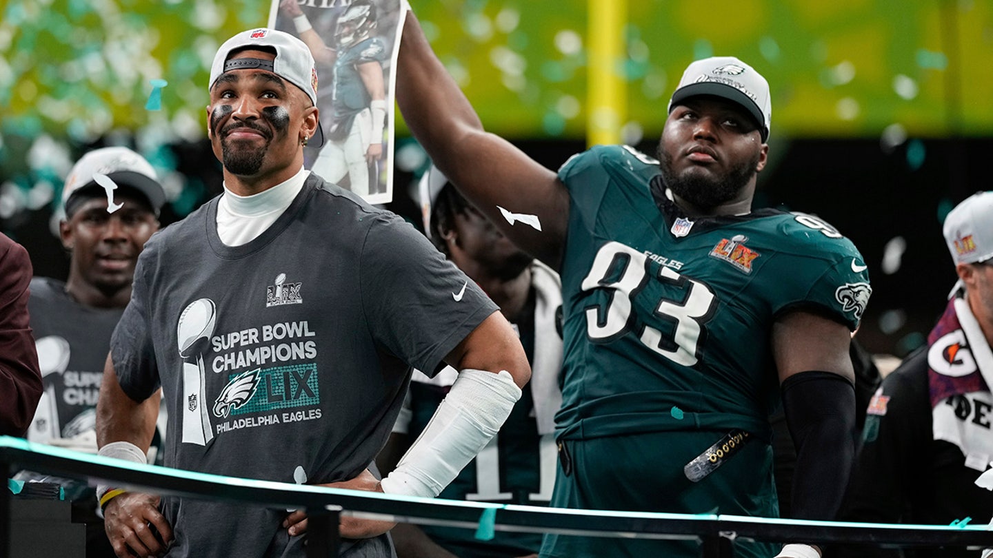 The quarter-arre of the Eagles of Philadelphia, Jalen, smiles on the podium next to the defensive platform Milton Williams (93) after a victory on the Chiefs of Kansas City in the Super Bowl on Sunday, February 9, 2025 in New Orleans . (AP photo / Matt Slocum)