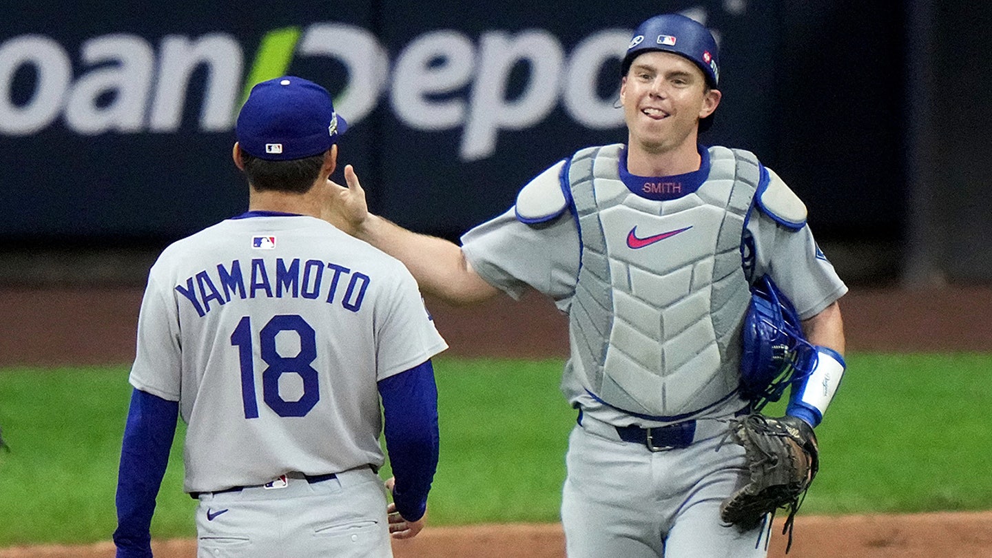 Los Angeles Dodgers pitcher Roki Sasaki and catcher Will Smith celebrate their victory against the Milwaukee Brewers in Game 3 of the National Baseball League Championship Series, Thursday, Oct. 16, 2025, in Los Angeles. (Mark J. Terrill/AP Photo)