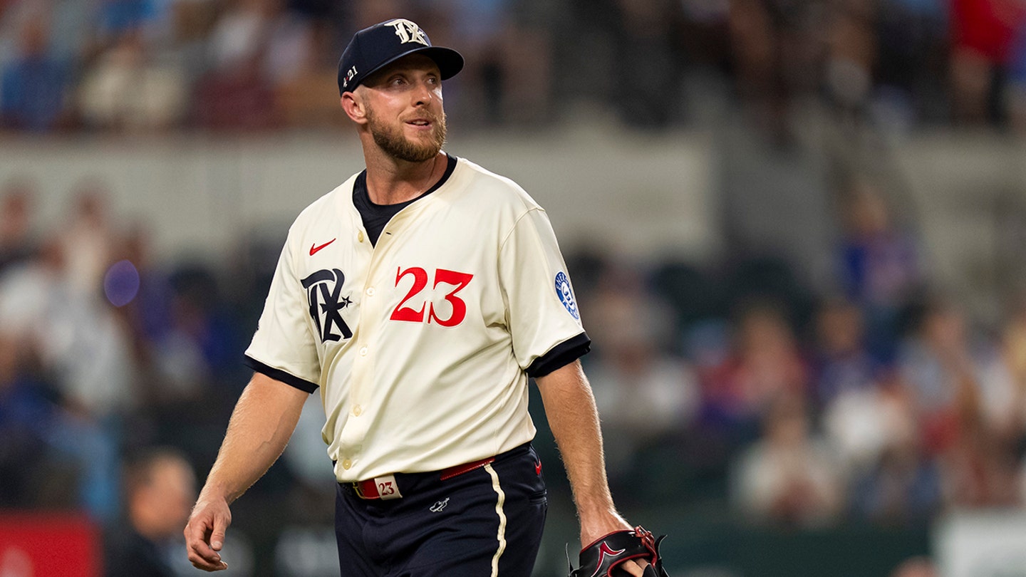 Merrill Kelly (23) of the Texas Rangers looks on during a game against the Philadelphia Phillies at Globe Life Field on August 8, 2025 in Arlington, Texas. (Bailey Orr/Texas Rangers/Getty Images)