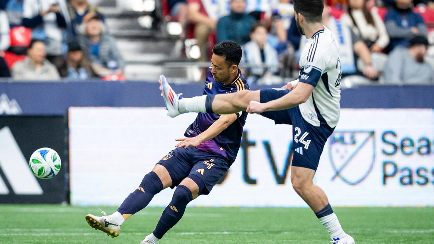 Maya Yoshida, # 4 from Los Angeles Galaxy, Brian White by Vancouver Whitecaps, Brian White, # 24, defends during the first half of a MLS football match in Vancouver, British Columbia, Sunday March 2, 2025. (Ethan Cairns / Canadian Press via AP)