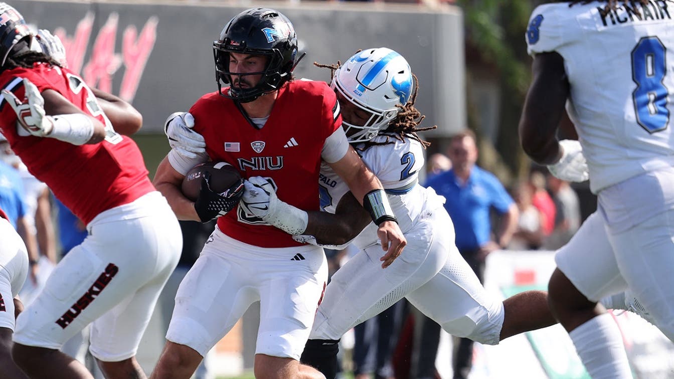 Northern Illinois Huskies quarterback Ethan Hampton (2) rushes the ball against Buffalo Bulls linebacker Red Murdock (2) during the first half at Huskie Stadium on September 21, 2024. (Mike Dinovo/Imagn Images)