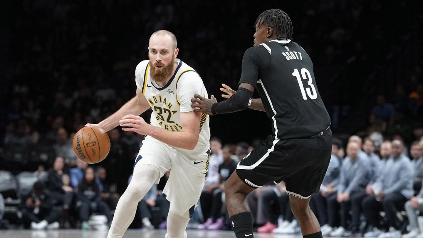 Indiana Pacers center Jay Huff dribbles the ball against Brooklyn Nets forward Trevon Scott during the second half at the Barclays Center in Brooklyn on April 9, 2026. (Gregory Fisher/Imagn Images)