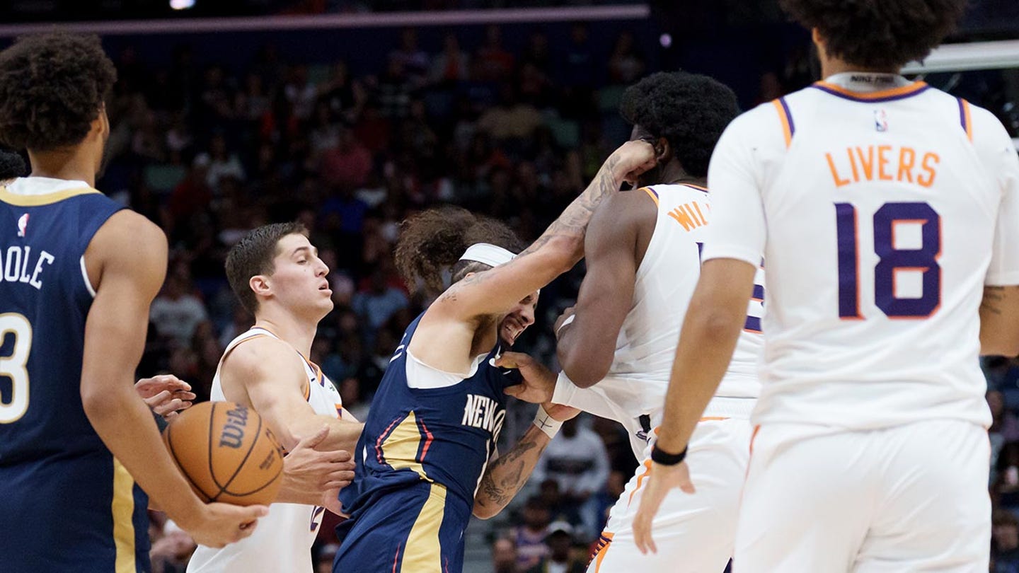 In the third quarter, Suns center Mark Williams tried to get into position to set a screen on Pelicans guard Jose Alvarado while Phoenix’s Collin Gillespie tried to get around him. Alvarado used both hands to try to push Williams out of his way, but was cautioned for a foul.