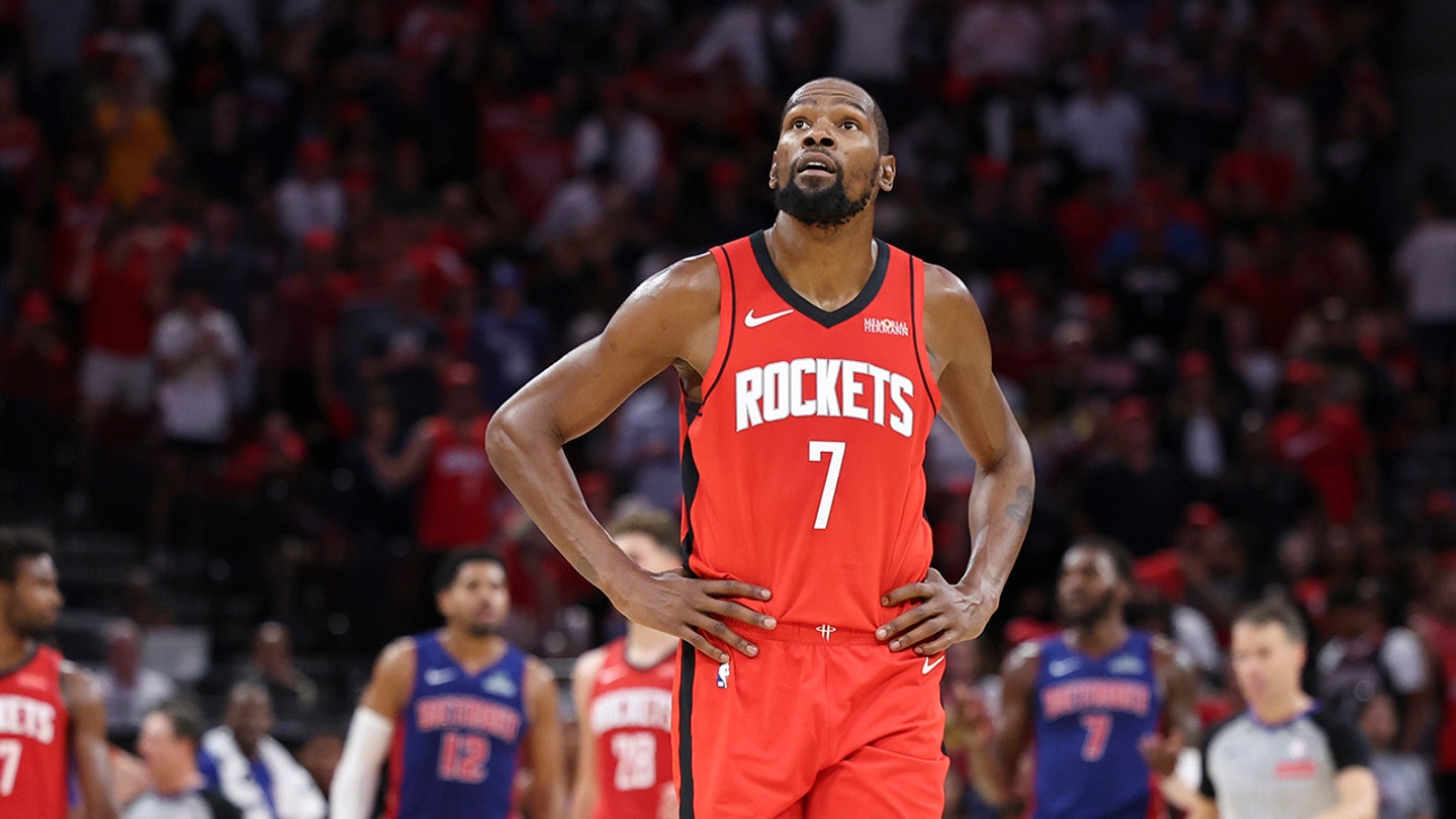 Houston Rockets forward Kevin Durant (7) looks on after a play during the fourth quarter against the Detroit Pistons at Toyota Center. (Trojan Taormina/Imagn Images)